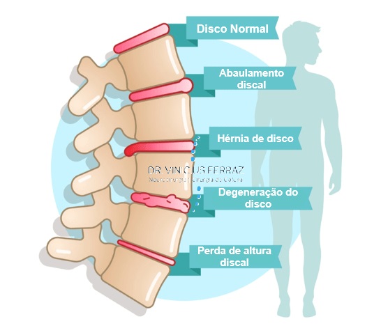 Em qualquer dessas etapas podem ocorrer hérnias de disco e consequente compressão de raízes nervosas, provocando nas pernas e/ou braços e sintomas neurológicos como queimação nas pernas/braços, choque, formigamento e perda de força.