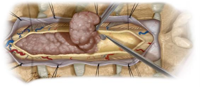 Intradural-Extramedular: O tumor está localizado dentro da dura-máter, mas fora da substância da medula espinhal. Ele cresce no espaço preenchido pelo líquido cefalorraquidiano que banha a medula. Tumores nesta localização geralmente se originam das raízes nervosas (como schwannomas e neurofibromas) ou das meninges (meningiomas). A cirurgia para esses tumores requer técnicas microcirúrgicas delicadas para dissecar o tumor da superfície da medula espinhal e dos nervos sem causar danos.